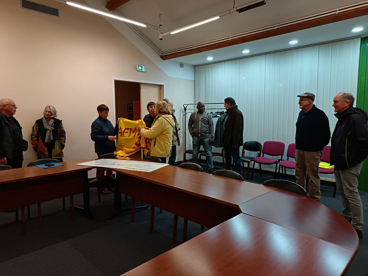 De bon matin et dans la brume, les gentils organisateurs de Randovilaine ont reconnu et balisé le trajet la veille du Téléthon (01/12/2024). Panneaux d’ avertissement routiers, calicots et panneaux guides pour les randonneurs.
